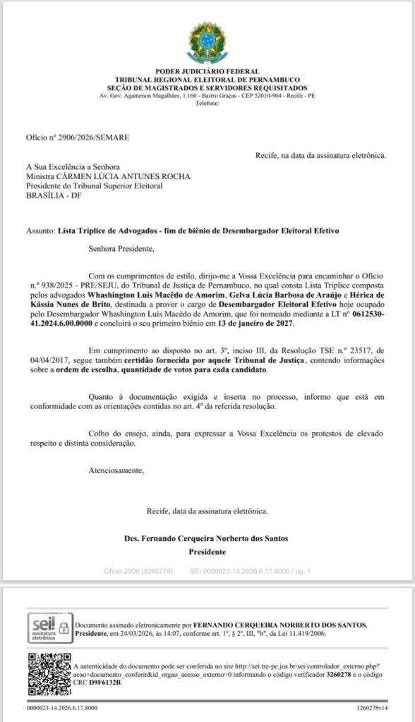 Após a homologação da lista pelo Tribunal de Justiça de Pernambuco (TJPE), o presidente do TRE-PE, desembargador Fernando Cerqueira Norberto dos Santos, formalizou o envio oficial da relação ao Tribunal Superior Eleitoral (TSE), por meio de ofício já expedido e assinado.